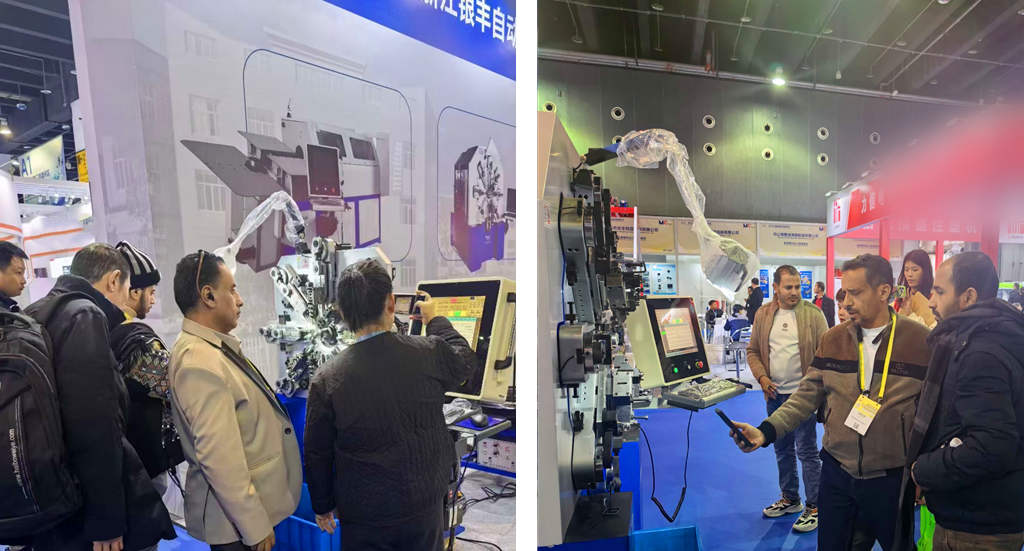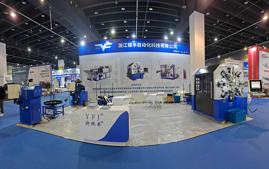 In the industrial machine tools exhibition area, Zhejiang YinFeng Spring Equipment Factory showcased its latest spring manufacturing technology, prominently featuring the YF-cnc-1425 14-axis camless spring machine.